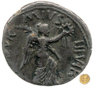 CLM388 Obverse: ![]() CAESAR ![]() AVGVSTVSTesta di Augusto rivolta verso destra. Reverse: ↻ M DVR - MIVS - IIIVIR Una Vittoria. che avanza verso destra. Nella mano destra tiene una ghirlanda, nella sinistra una palma. | |
