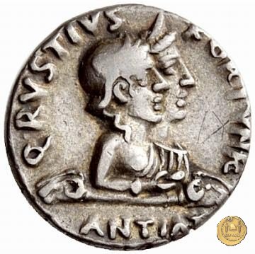 CLM389 Obverse: ↻ Q RVSTIVS - FORTUN ![]() → ANTIATI busti della Fortuna Victrix (in primo piano) e della Fortuna Felix (in secondo piano) sovrapposti. La prima è elmata e drappeggiata e tiene una patera con la mano destra, la seconda è diademata e drappeggiata. Entrambe sono poste sopra a delle aste con apici a corna di ariete. Reverse: ↻ CAESA - RI AVGVSTO; → FOR RE; → EX S C (esergo) Un altare ornato e iscritto. | |