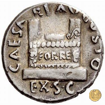 CLM340 Obverse: Testa di Ottaviano (Augusto) rivolta verso destra. Reverse: → IMP CAESAR Un tempio (Curia Giulia?) con intorno un portico a colonne e architrave iscritto. Nel frontone una figura seduta in mezzo a due animali. Il tetto è sormontato, al centro, da una Vittoria su globo e ai lati da due guerrieri. | |