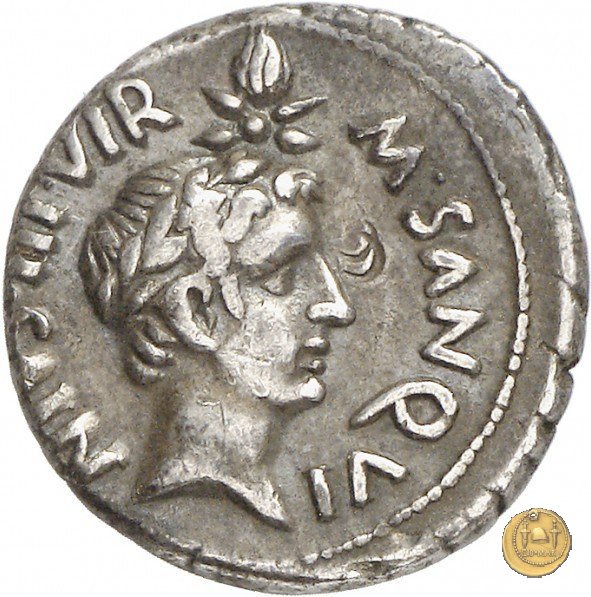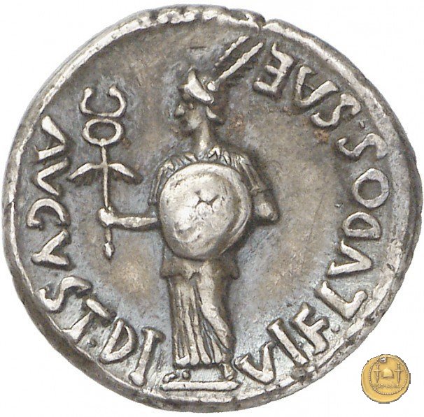 CLM391 Obverse: ![]() AVGVST DI ![]() VI F LVDOS SAEUn araldo, elmato, rivolto verso sinistra. Con la mano destra tiene un caduceo alato e con la sinistra uno scudo con una stella iscritta. Reverse: ![]() M SANQVI ![]() NIVS IIIVIRTesta giovanile (Giulio Cesare oppure il Genio Saecuili Novi), laureata, rivolta verso destra. Sopra, una stella cometa con quattro raggi e una coda. |