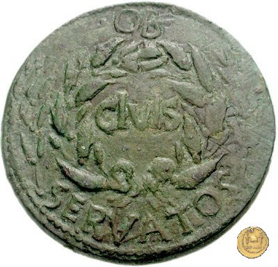 CLM480 Obverse: ![]() OB → CIVIS ![]() SERVATOSUna ghirlanda di quercia affiancata da due rami di alloro. Reverse: ↻ CN PISO CN F IIIVIR A A A F F; → S C • | |
