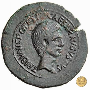 CLM1 Obverse: ![]() TI CAESAR DIVI ![]() AVG F AVGVSTVSTesta di Tiberio laureata e rivolta verso destra. Reverse: ![]() TR POT XVI; → IMP VII (esergo)Tiberio, laureato, alla guida di una quadriga rivolta verso destra. Nella mano destra un ramo d'alloro e nella sinistra uno scettro con aquila. | |