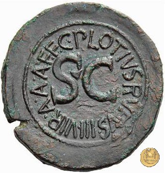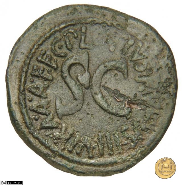 CLM6 Obverse: ![]() TI CAESAR DIVI ![]() AVG F AVGVSTVSTesta di Tiberio laureata e rivolta verso destra. Reverse: ![]() PONTIF ![]() MAXIMFigura femminile (Livia, Pax o la Giustizia) seduta su di una sedia ornata, rivolta verso destra. Nella mano destra una lancia rivolta verso il basso, nella sinistra un ramo. A fare da pavimento abbiamo tre linee. | |