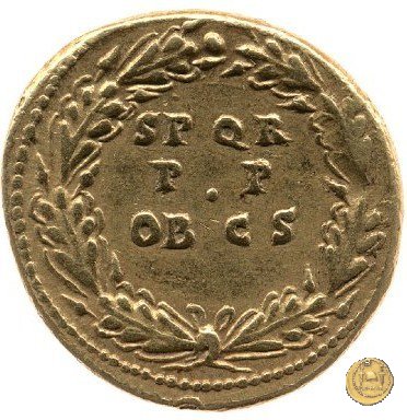 CLM41 Obverse: ↻ C CAESAR DIVI AVG PRON AVG P M TR P III P P Testa di Caligola, laureata, rivolta verso sinistra. Reverse: → S P Q R / P P / OB CIVES / SERVATOS La legenda, su quattro linee, circondata da una corona di quercia. | |