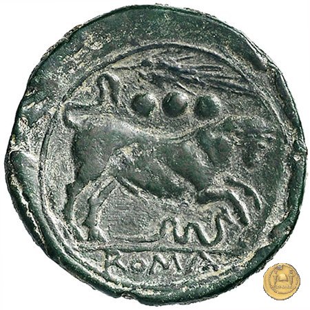 42/2 - Quadrante Dritto: Testa di Ercole a destra, con il capo avvolto nella pelle di cinghiale. Dietro tre globetti. Verso: Toro caricante a destra. In alto tre globetti e, di solito, una spiga di grano; in basso un serpente. Nell'esergo: ROMA | |