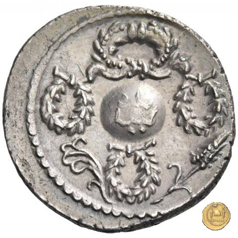 445/1 - denario L. Cornelius Crus Lentulus / C. Claudius Marcellus Dritto: Triskeles composta da tre spighe di grano alternate da tre gambe umane e con al centro la testa alata di Medusa. Verso: LENT . MAR - COS Giove, in nudità eroica, stante frontalmente con testa a destra; tiene il fulmine con la mano destra e regge un'aquila con la sinistra. A destra un falcetto (l'harpa). | |