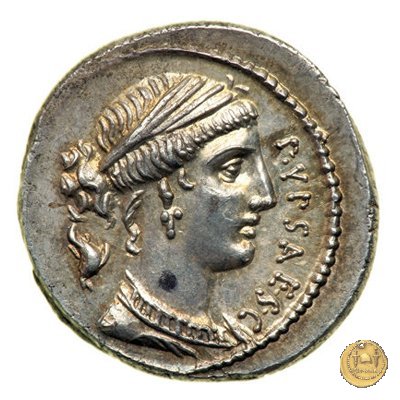 472/3 - quinario L. Papius Celsus Dritto: Busto della Vittoria a destra. Verso: L. PAPIVS - CELSVS Una fanciulla in atto di nutrire un serpente eretto di fronte a lei. | |