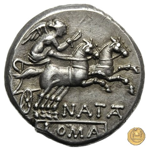 200/1 - denario Pinarius Natta Dritto: Testa di Roma a destra, con elmo attico alato. Dietro: ![]() ![]() Verso: NAT - ROMA La Vittoria su biga verso destra; tiene la frusta con la mano destra, le redini con la sinistra. | |