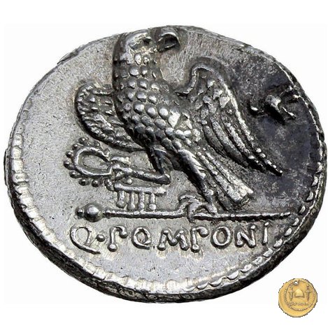 398/1 - denario Q. Pomponius Rufus Dritto: RVFVS - S. C Testa laureata di Giove a destra. Verso: Q. POMPONI Aquila ad ali spiegate su scettro con la zampa sinistra; con la destra tiene una corona. Sotto la corona, un numero di controllo; nel campo a destra un simbolo di controllo. | |