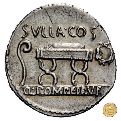 434/2 - denario Q. Pompeius Rufus Dritto: Q. POMPEI. Q. F / RVFVS - COS Sedia curule. A sinistra una freccia; a destra un ramo d'alloro. Verso: SVLLA. COS - Q. POMPEI. RVF Sedia curule. A sinistra un lituus; a destra una corona d'alloro. | |