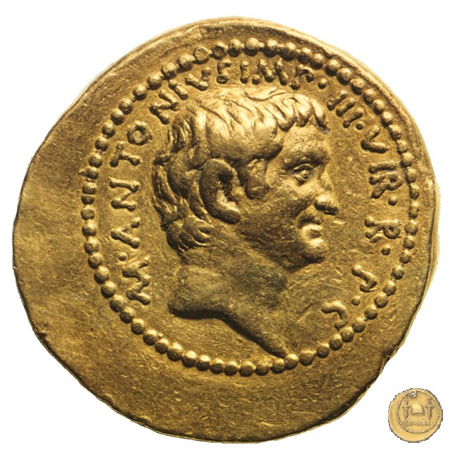 493/1 - aureo C. Iulius Caesar Octavianus / M. Antonius Dritto: C. CAESAR. IMP. III. VIR. R. P. C. PONT . AV (G) Testa di Ottaviano a destra. Verso: M. ANTONIVS. IM(P). III. VIR. R. P. C. AV G Testa di Marc'Antonio a destra. | |