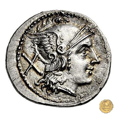 59/1 - apex e martello (apex and hammer) Dritto: Testa di Roma a destra, con elmo attico alato. Dietro: ![]() ![]() Verso: ROMA I Dioscuri a cavallo verso destra, con lancia in resta; due stelle sopra i loro pilei. In alto apex e martello. |