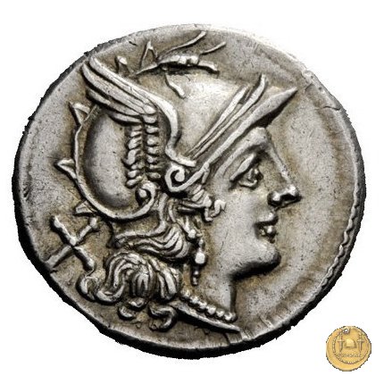 57/2 - crescente (crescent) Dritto: Testa di Roma a destra, con elmo attico alato. Dietro: ![]() ![]() Verso: ROMA (in cornice lineare) I Dioscuri a cavallo verso destra, con lancia in resta; due stelle sopra i loro pilei. In alto un crescente. | |