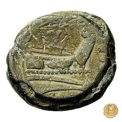 (247) - triente P. Calpurnius Dritto: Testa elmata di Minerva a destra. In alto quattro globetti. Verso: P. CALP Nave a remi navigante verso destra, con il pilota al timone e la Vittoria che regge una corona vittata; uno stendardo a prua. In alto: P. CALP ; davanti quattro globetti; in basso un delfino. Inscritto sulla fiancata della nave: ROMA | |