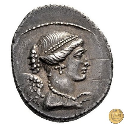 460/3 - denario Q. Caecilius Metellus / P. Licinius Crassus Iunianus Dritto: CRASS. IVN - LEG. PRO. PR Testa femminile a destra, con corona turrita. A sinistra una spiga di grano; a destra un caduceo; in alto un oggetto rettangolare; in basso un rostrum tridens. Una corona d'alloro come contorno. Verso: METEL. PIVS - SCIP. IMP Trofeo d'armi con elmo, corazza, scudo rotondo, spada, arco e faretra. A sinistra un lituus; a destra una brocca. | |