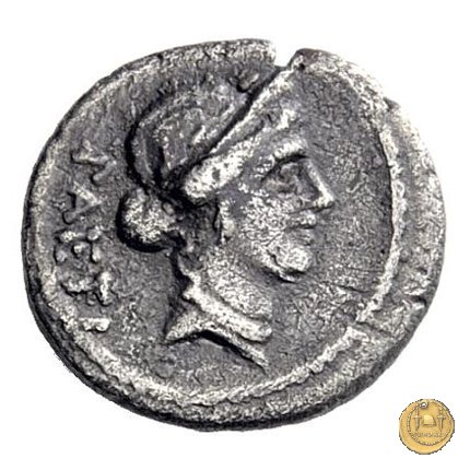 512/2 - denario C. Clodius C.f. Vestalis Dritto: C. CLODIVS - C. F Busto drappeggiato di Flora a destra, con corona di fiori e di foglie. Dietro un fiore (a forma di giglio). Verso: VESTALIS Figura femminile seduta a sinistra; tiene il culullus con la mano destra. | |