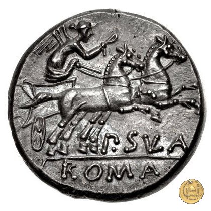205/1 - denario P. Cornelius Sulla Dritto: Testa di Roma a destra, con elmo attico alato. Dietro: ![]() ![]() Verso: P. SVL A - ROMA La Vittoria su biga verso destra; tiene la frusta con la mano destra, le redini con la sinistra. | |