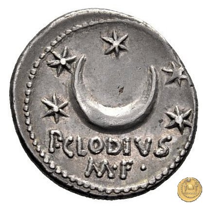 494/21 - denario P. Clodius M.f. Dritto: Testa radiata del Sole a destra. Dietro una faretra. Verso: P. CLODIVS / M. F Crescente lunare contornato da cinque stelle. | |