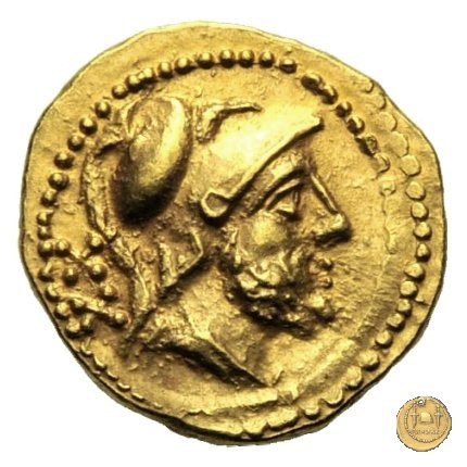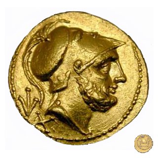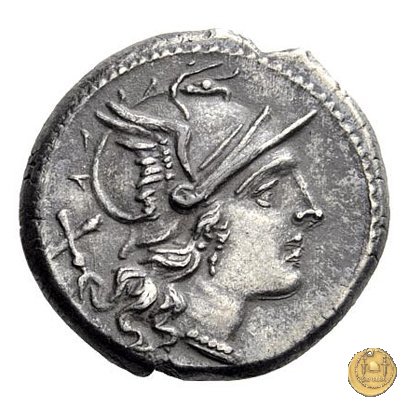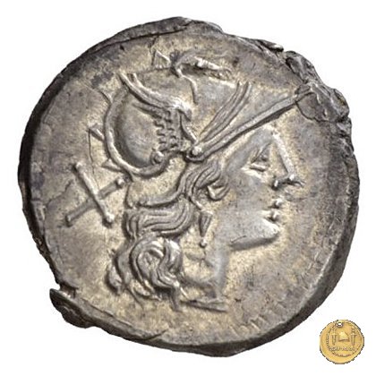 170/1 - orecchio (ear) Obverse: Testa di Roma a destra, con elmo attico alato. Dietro: ![]() ![]() Reverse: ROMA I Dioscuri a cavallo verso destra, con lancia in resta; due stelle sopra i loro pilei. Sotto un orecchio. | |