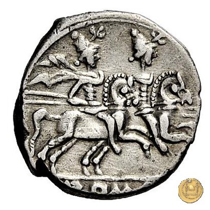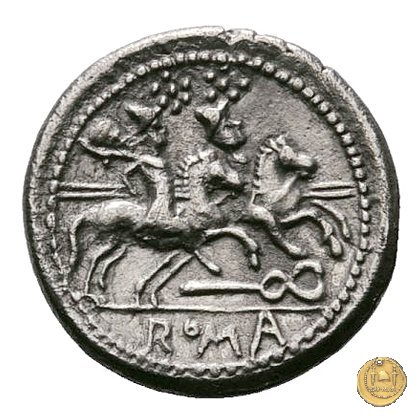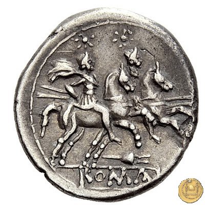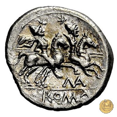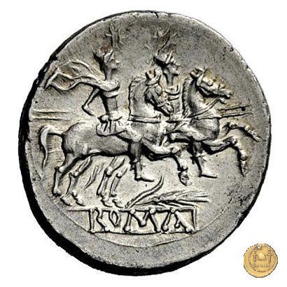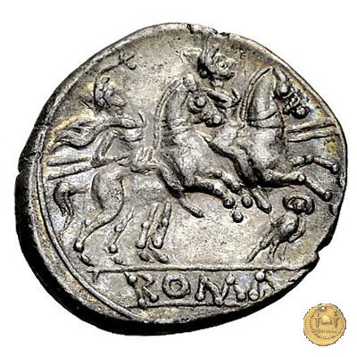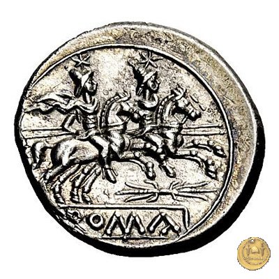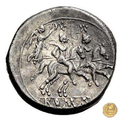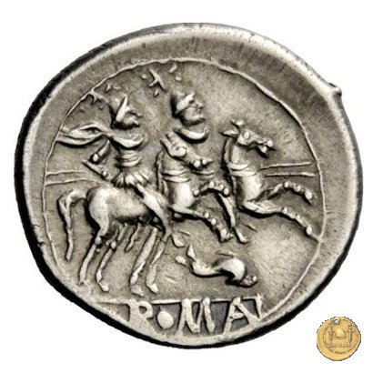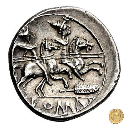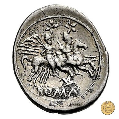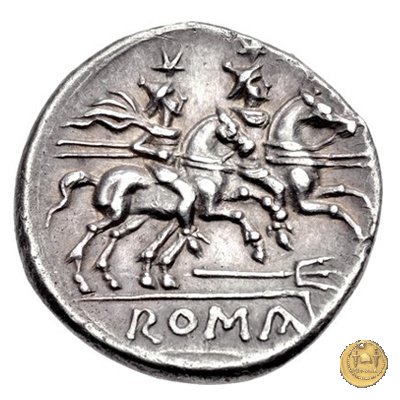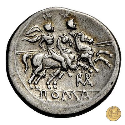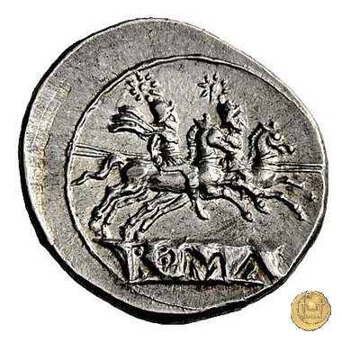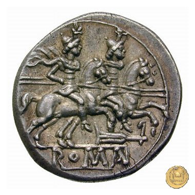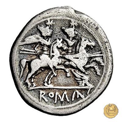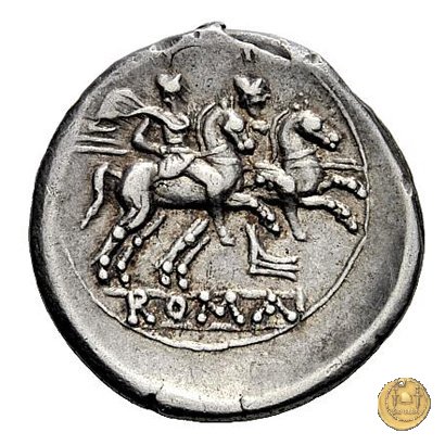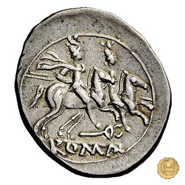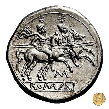 62/1 - rostro di nave (rostrum tridens) Obverse: Testa di Roma a destra, con elmo attico alato. Dietro: ![]() ![]() Reverse: ROMA I Dioscuri a cavallo verso destra, con lancia in resta; due stelle sopra i loro pilei. Sotto un rostro di nave (rostrum tridens). | |