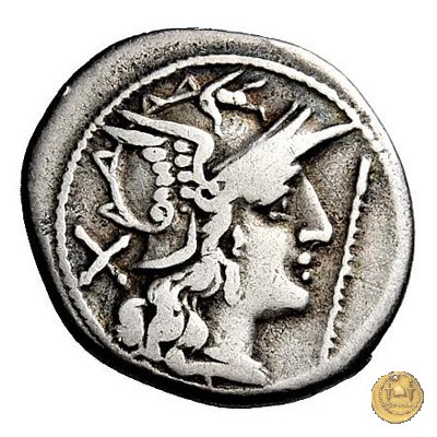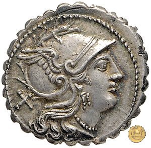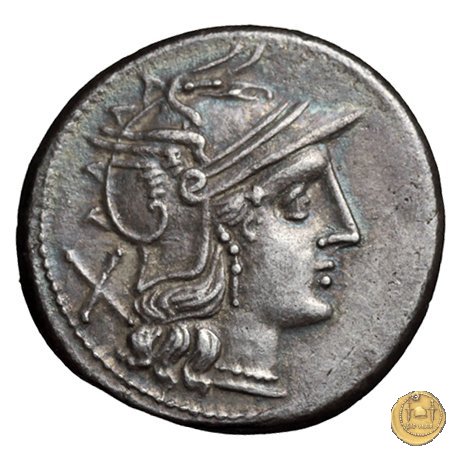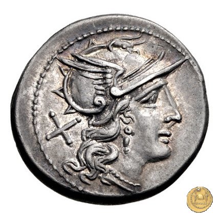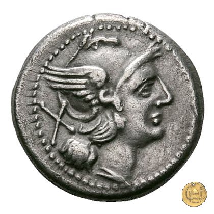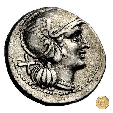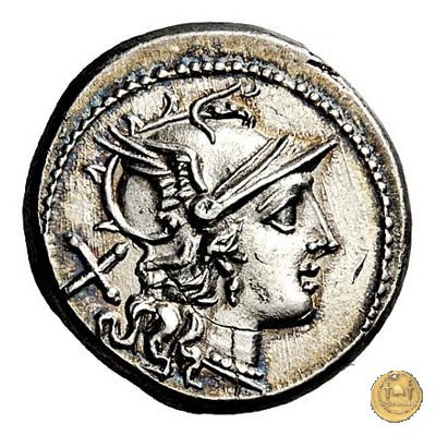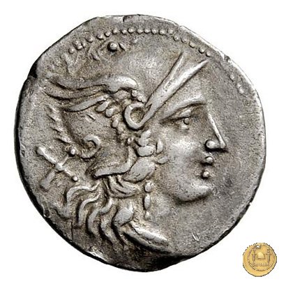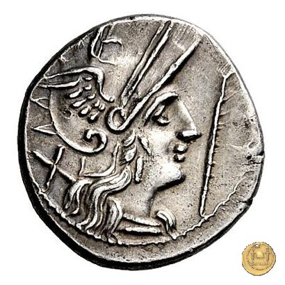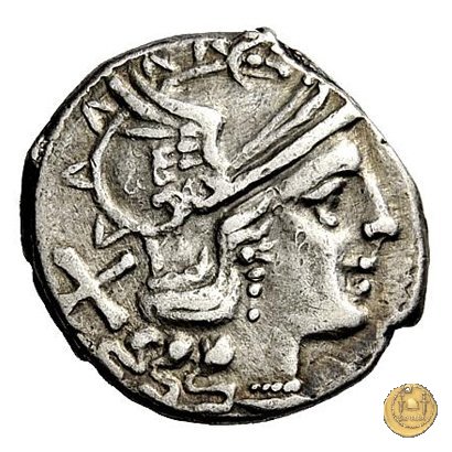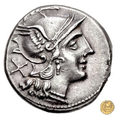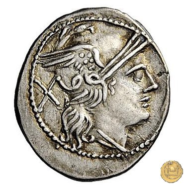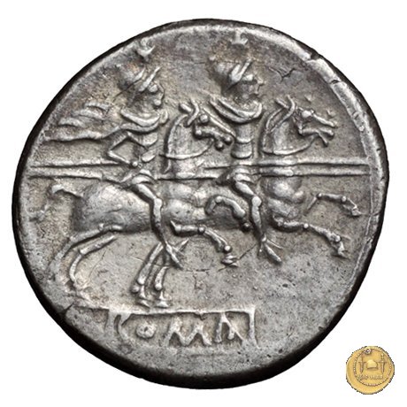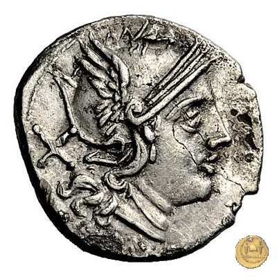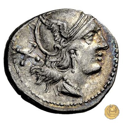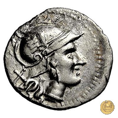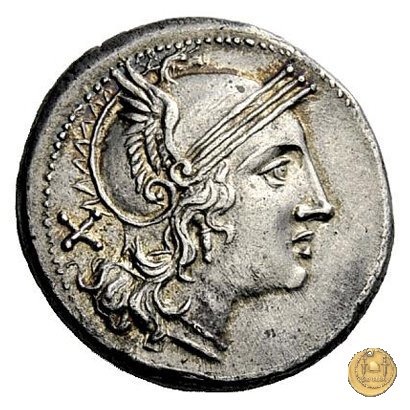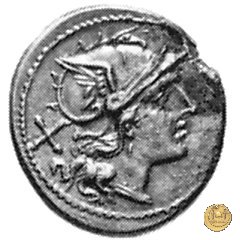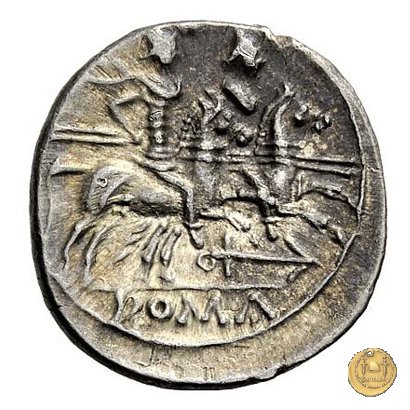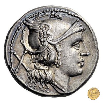 62/1 - rostro di nave (rostrum tridens) Obverse: Testa di Roma a destra, con elmo attico alato. Dietro: ![]() ![]() Reverse: ROMA I Dioscuri a cavallo verso destra, con lancia in resta; due stelle sopra i loro pilei. Sotto un rostro di nave (rostrum tridens). | |