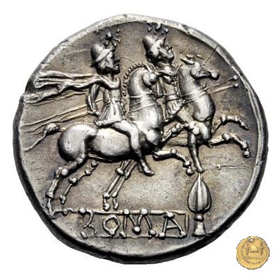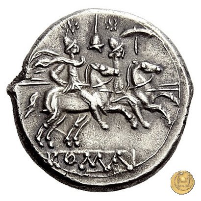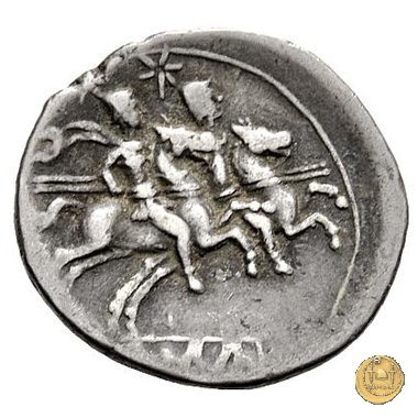 72/4 - spiga di grano (corn-ear) Obverse: Testa di Roma a destra, con elmo attico alato. Dietro: V Reverse: ROMA I Dioscuri a cavallo verso destra, con lancia in resta; due stelle sopra i loro pilei. Sotto una spiga di grano. | |