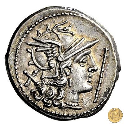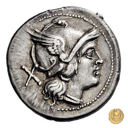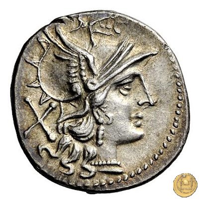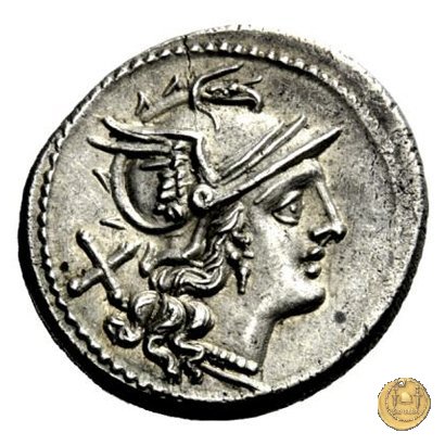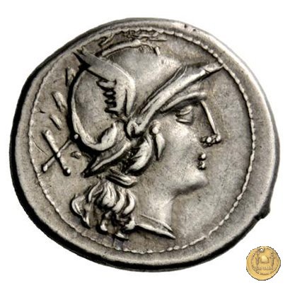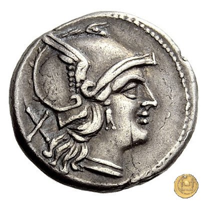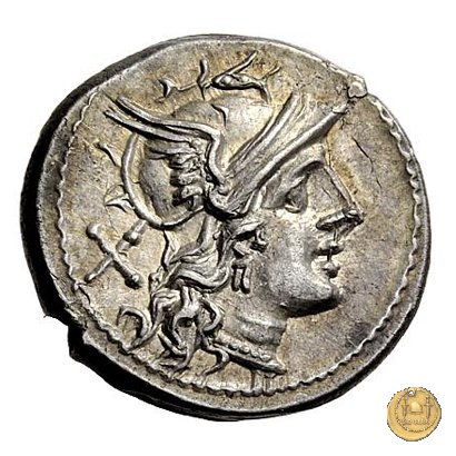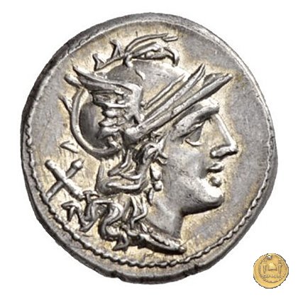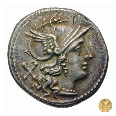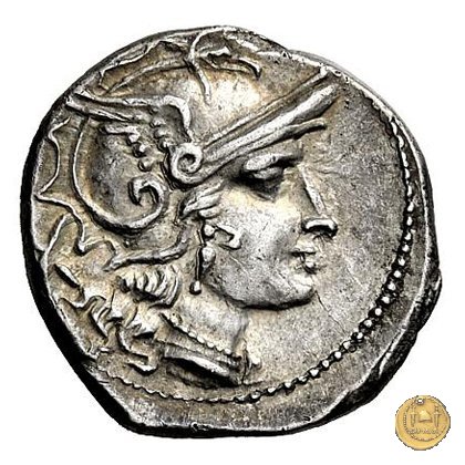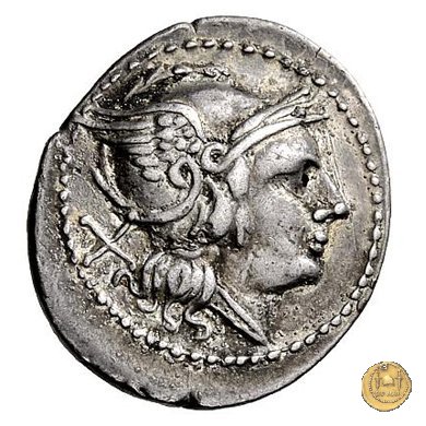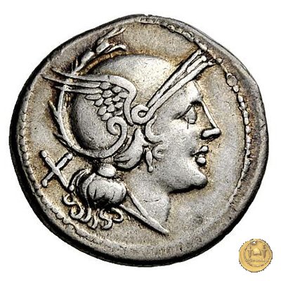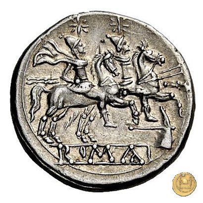 89/2 - clava (club) Obverse: Testa di Roma a destra, con elmo attico alato. Dietro: ![]() ![]() Reverse: ROMA I Dioscuri a cavallo verso destra, con lancia in resta; due stelle sopra i loro pilei. Sotto una clava. | |