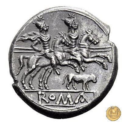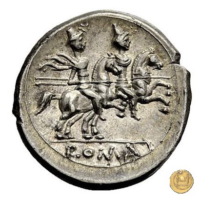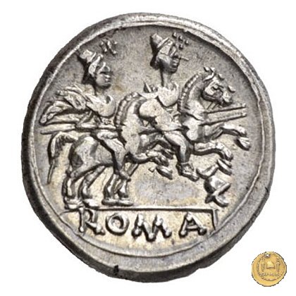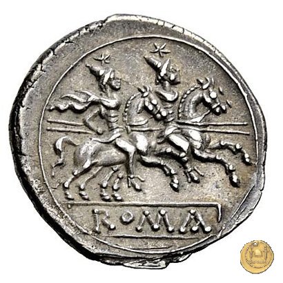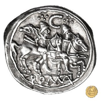 57/2 - crescente (crescent) Obverse: Testa di Roma a destra, con elmo attico alato. Dietro: ![]() ![]() Reverse: ROMA (in cornice lineare) I Dioscuri a cavallo verso destra, con lancia in resta; due stelle sopra i loro pilei. In alto un crescente. | |