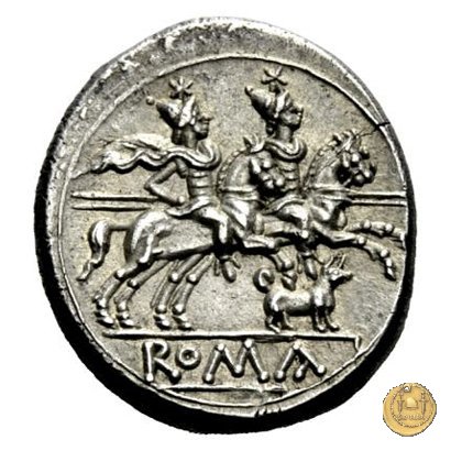 122/2 - cane (dog) Obverse: Testa di Roma a destra, con elmo attico alato. Dietro: ![]() ![]() Reverse: ROMA I Dioscuri a cavallo verso destra, con lancia in resta; due stelle sopra i loro pilei. Sotto un cane. | |