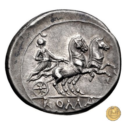 77/1 - spiga di grano e bastone (corn-ear and crooked staff) Obverse: Testa di Roma a destra, con elmo attico alato; un occhiello sulla visiera. Dietro: ![]() ![]() Reverse: ROMA I Dioscuri a cavallo verso destra, con lancia in resta; due stelle sopra i loro pilei. Sotto una spiga di grano e un bastone. | |