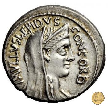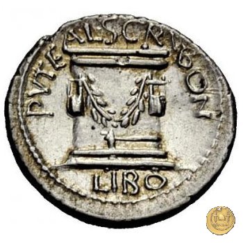 417/1 - denario L. Aemilius Lepidus Paullus / L. Scribonius Libo Dritto: PAVLLVS LEPIDVS - CONCORD Testa velata della Concordia a destra, con diadema. Verso: PVTEAL SCRIBON - LIBO Pozzo (puteal Scribonianum) ornato con ghirlanda d'alloro e con due lyrae ai lati. Alla base un martello (o una tenaglia). | |