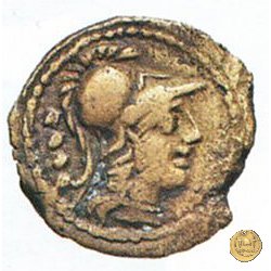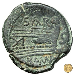 199/4 - triente Atilius Saranus Dritto: Testa elmata di Minerva a destra. In alto quattro globetti. Verso: SAR Prora di nave a destra. In alto: SAR ; davanti quattro globetti; in basso: ROMA | |