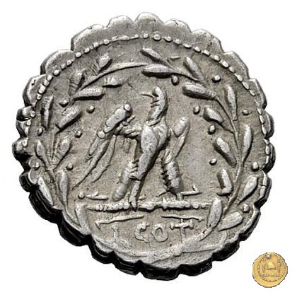 314/1 - denario L. Aurelius Cotta Dritto: Busto drappeggiato di Vulcano a destra, con berretto conico laureato. Dietro: ![]() e le tenaglie. Attorno una corona (di mirto).Verso: L. COT Aquila ad ali spiegate su fulmine. Attorno una corona di alloro. | |