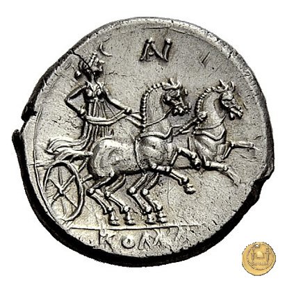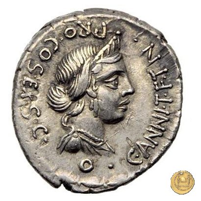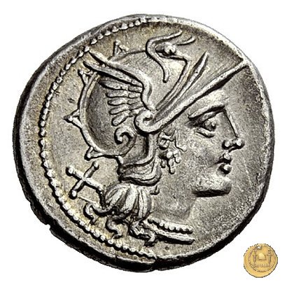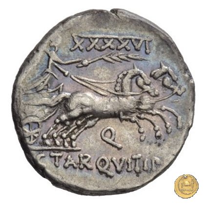 366/4 - denario C. Annius T.f.T.n. / C. Tarquitius P.f. Dritto: C. ANNIVS. T. F. T. N. PRO. COS. EX. S. C Testa femminile a destra, con diadema. Davanti una bilancia. Verso: C. TARQVITI. P. F La Vittoria su biga verso destra; tiene le redini con la mano sinistra, un ramo di palma con la destra. In alto un numero di controllo. In basso: Q | |