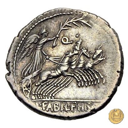 366/3 - denario C. Annius T.f.Tn. / L. Fabius L.f. Hispaniensis Dritto: C. ANNIVS. T. F. T. N. PRO. COS. EX. S. C Testa femminile a destra, con diadema. Davanti una bilancia. Verso: L. FABI. L. F - HISP. Q La Vittoria su quadriga al passo verso destra; tiene le redini con la mano sinistra, un ramo di palma con la destra. | |