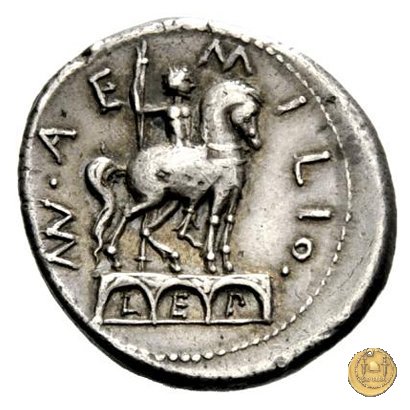 291/1 - denario Mn. Aemilius Lepidus Dritto: ROMA Busto femminile (Roma?) a destra, drappeggiato, laureato e con diadema. Dietro: ![]() ![]() Verso: MN . AEMILIO Su tre arcate poggia una statua equestre con cavallo a destra; il cavaliere con corazza e corona, tiene la lancia piantata a terra con la mano destra. Tra gli archi: LEP | |