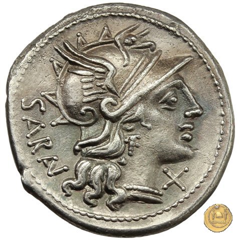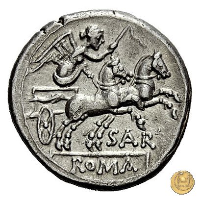 199/1 - denario Atilius Saranus Dritto: Testa di Roma a destra, con elmo attico alato. Dietro: ![]() ![]() Verso: SAR - ROMA La Vittoria su biga verso destra; tiene la frusta con la mano destra, le redini con la sinistra. | |