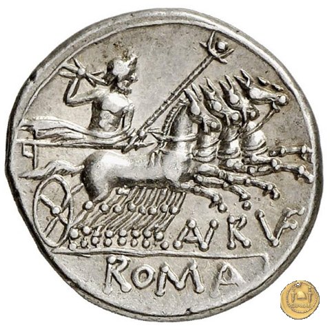 227/1 - denario M. Aufidius Rusticus Dritto: RVS Testa di Roma a destra, con elmo attico alato. Dietro: XVI Verso: M. AVF - ROMA Giove su quadriga verso destra; tiene lo scettro e le redini con la mano sinistra e sta per scagliare il fulmine con la destra. | |