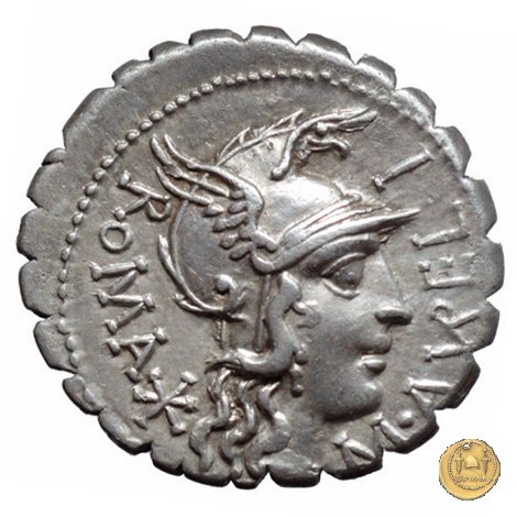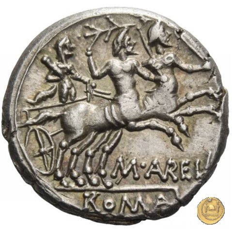 136/1 - denario Aurelius Dritto: Testa di Roma a destra, con elmo attico alato. Dietro: ![]() ![]() Verso: AV - ROMA La Luna su biga verso destra. | |