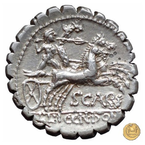 282/1 - denario M. Aurelius Scaurus Dritto: M. AVR ELI - ROMA Testa di Roma a destra, con elmo frigio o attico alato. Dietro: ![]() ![]() Verso: SCAVR I - L. LIC. CN. DOM Guerriero nudo su biga verso destra; tiene lo scudo, il carnyx e le redini con la mano sinistra e sta per scagliare la lancia con la destra. | |