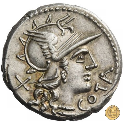 229/1 - denario M. Aurelius Cotta Dritto: COTA Testa di Roma a destra, con elmo attico alato. Dietro: ![]() ![]() Verso: M. AVR ELI - ROMA Ercole su biga di centauri verso destra; tiene le redini con la mano sinistra, la clava con la destra. I centauri tengono ciascuno con la sinistra un lungo ramo. | |