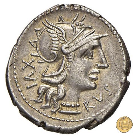 221/1 - denario T. Annius Rufus Dritto: Testa di Roma a destra, con elmo attico alato. Dietro: ![]() ![]() Verso: AV . RVF - ROMA Giove su quadriga verso destra; tiene lo scettro e le redini con la mano sinistra e sta per scagliare il fulmine con la destra. | |