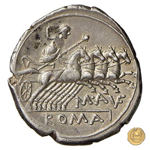 255/1 - denario M. Acilius M.f. Dritto: M. ACILIVS. M. F Testa di Roma a destra, con elmo attico alato. Dietro: ![]() ![]() Verso: ROMA Ercole su quadriga al passo verso destra; tiene le redini e un trofeo con la mano sinistra, la clava con la destra. | |