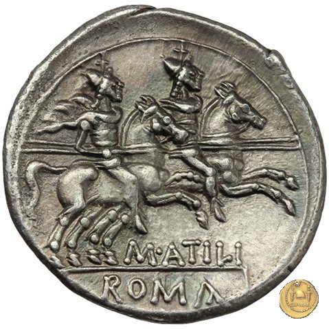 214/1 - denario M. Atilius Saranus Dritto: SARAN Testa di Roma a destra, con elmo attico alato. Davanti: ![]() ![]() Verso: M. ATIL - ROMA I Dioscuri a cavallo verso destra. | |
