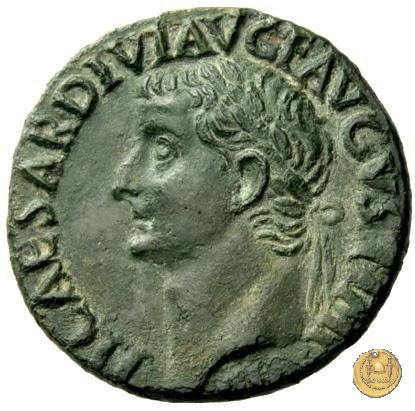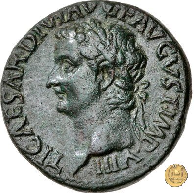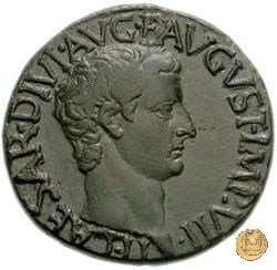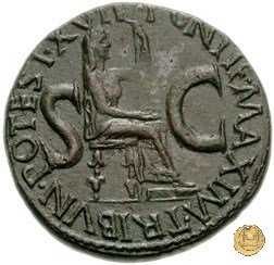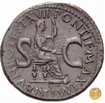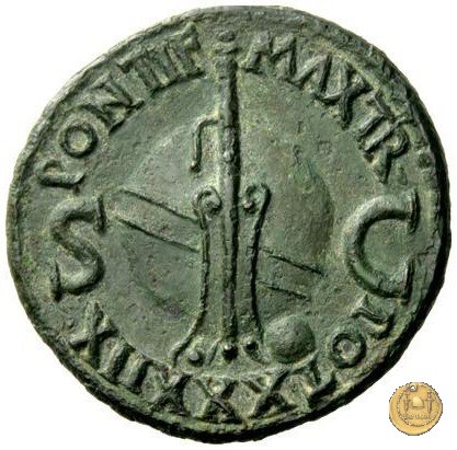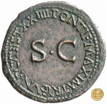 CLM77 Obverse: ↻ TI CAESAR DIVI AVG F AVGVST IMP VIII Testa di Tiberio laureata rivolta verso sinistra. Reverse: ↻ PONTIF - MAX TR - POT XXXIIX; → S - C Un timone in posizione verticale sovrapposto ad un globo; un altro piccolo globo si trova alla base del timone, sulla destra. | |
