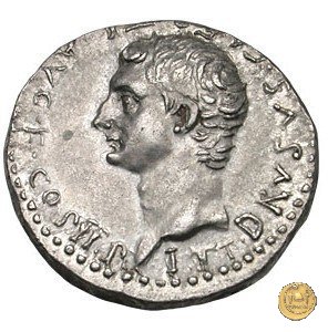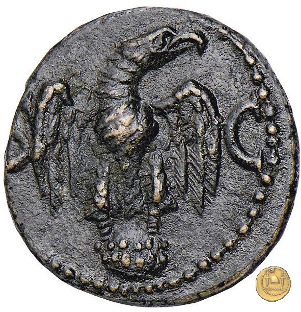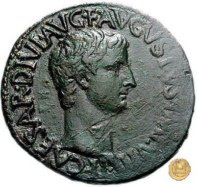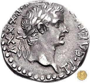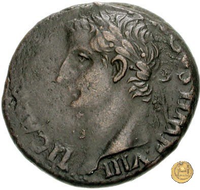 CLM62 Obverse: ↻ TI CAESAR DIVI AVGVSTI F AVGVSTVS Testa laureata di Tiberio rivolta verso destra. Reverse: ↻ PONT MAXIM COS III IMP VII TR POT XXII Un caduceo in mezzo a due cornucopie che si incrociano. | |