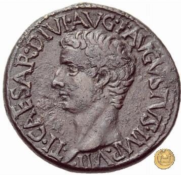 CLM42 Obverse: → DIVO / AVGVSTO / S P Q R Quadriga di elefanti rivolta verso sinistra con fantini. Augusto, radiato, si trova sul carro, con in mano un ramo di alloro e uno scettro. Reverse: ↻ TI CAESAR DIVI AVG F AVGVST P M TR POT XXXVII; → S C • | |