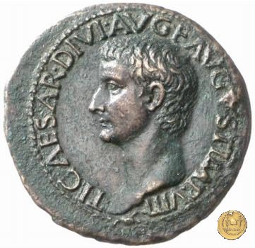 CLM42 Obverse: → DIVO / AVGVSTO / S P Q R Quadriga di elefanti rivolta verso sinistra con fantini. Augusto, radiato, si trova sul carro, con in mano un ramo di alloro e uno scettro. Reverse: ↻ TI CAESAR DIVI AVG F AVGVST P M TR POT XXXVII; → S C • | |