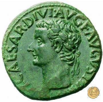 CLM42 Obverse: → DIVO / AVGVSTO / S P Q R Quadriga di elefanti rivolta verso sinistra con fantini. Augusto, radiato, si trova sul carro, con in mano un ramo di alloro e uno scettro. Reverse: ↻ TI CAESAR DIVI AVG F AVGVST P M TR POT XXXVII; → S C • | |