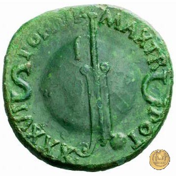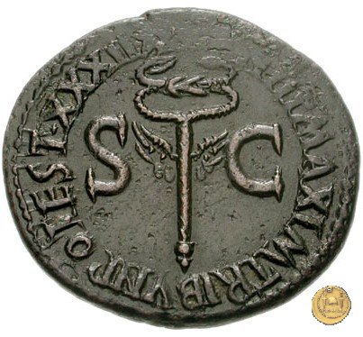 CLM75 Obverse: ↻ TI CAESAR DIVI AVG F AVGVST IMP VIII Testa di Tiberio laureata rivolta verso sinistra. Reverse: ↻ PONTIF - MAX TR - POT XXXVII; → S - C Un timone in posizione verticale sovrapposto ad un globo; un altro piccolo globo si trova alla base del timone. | |